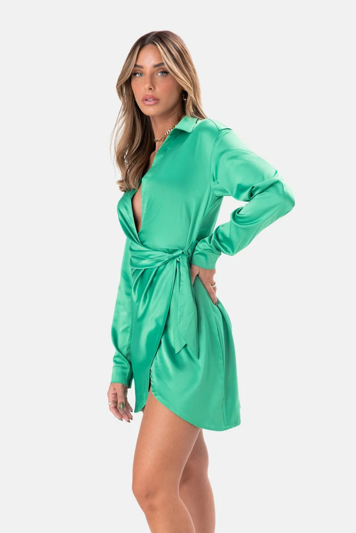 - Fancy dinner for 2. Wrap style, shirt dress in sleek satin finish featuring a classic collar, V neck and inner thin tie strings. Including additional wide tie straps, rounded front hem and long sleeves with button cuffs.