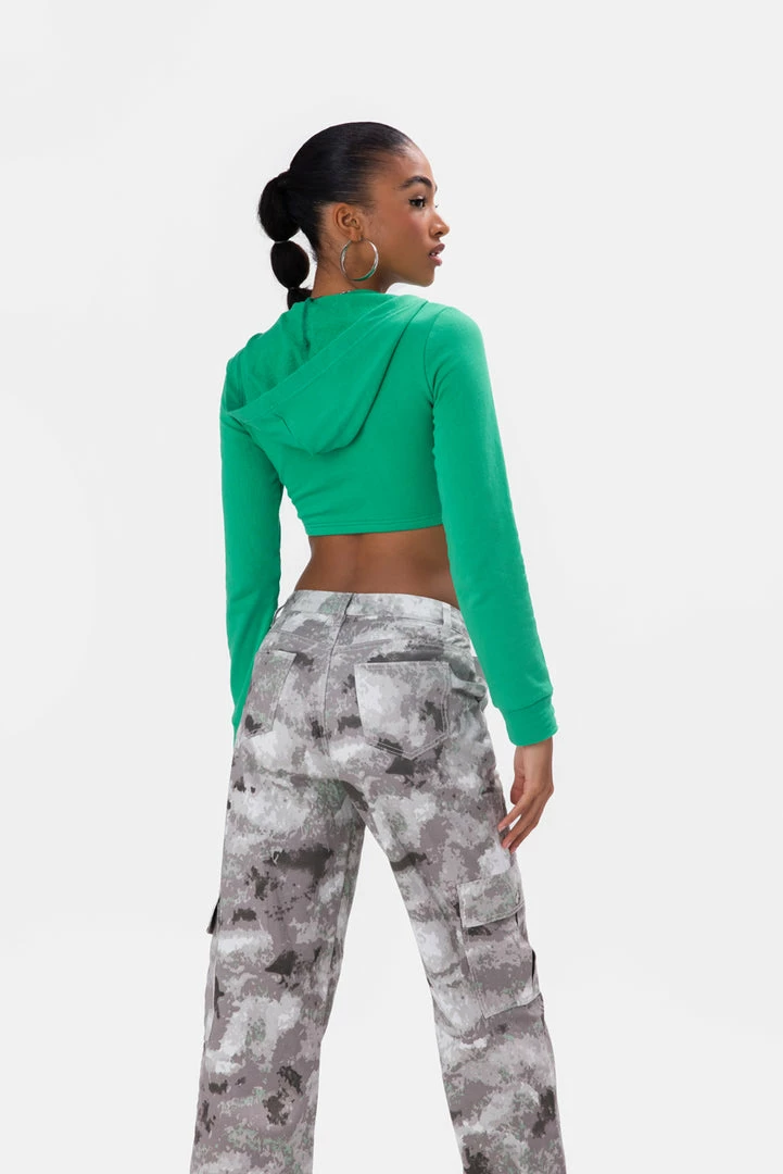 - Casual but make it stylized. Cropped jersey top with hood, front zip closure, tonal seam detail and corset-style hem.