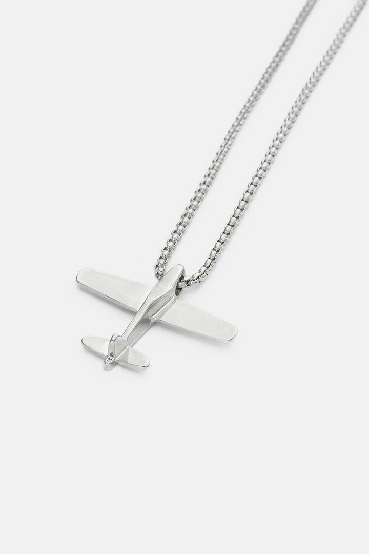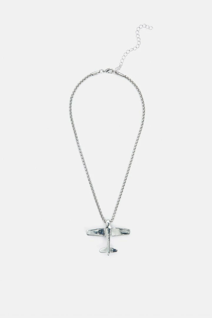 - Join the jet set club. Dainty chain necklace in a metallic finish with a large airplane pendant and an adjustable closure.