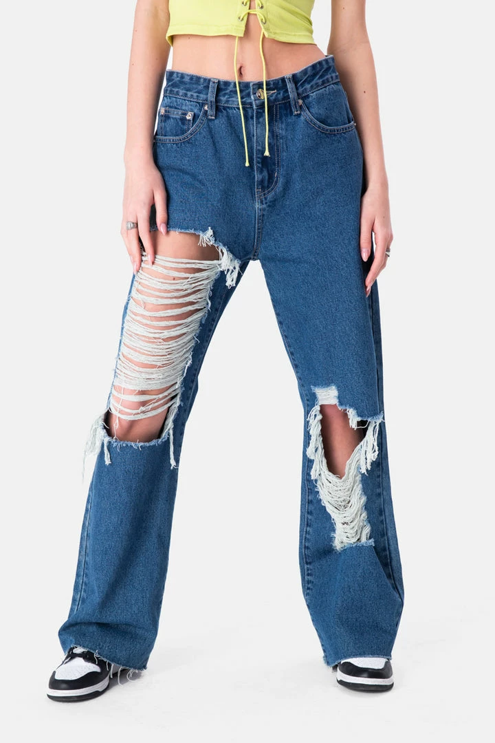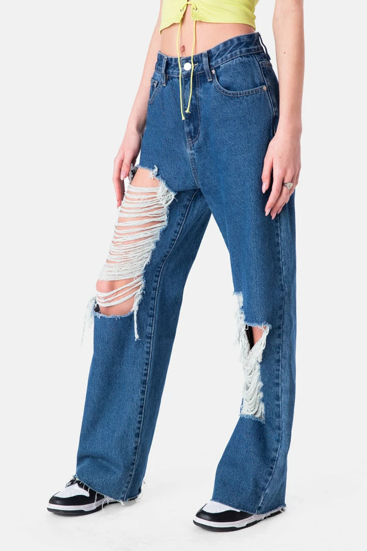 - Issa wide thang. Wide jeans in a super loose fit with mega distressed detail in the front, button and zip closure, belt loops and a 5-pocket design.