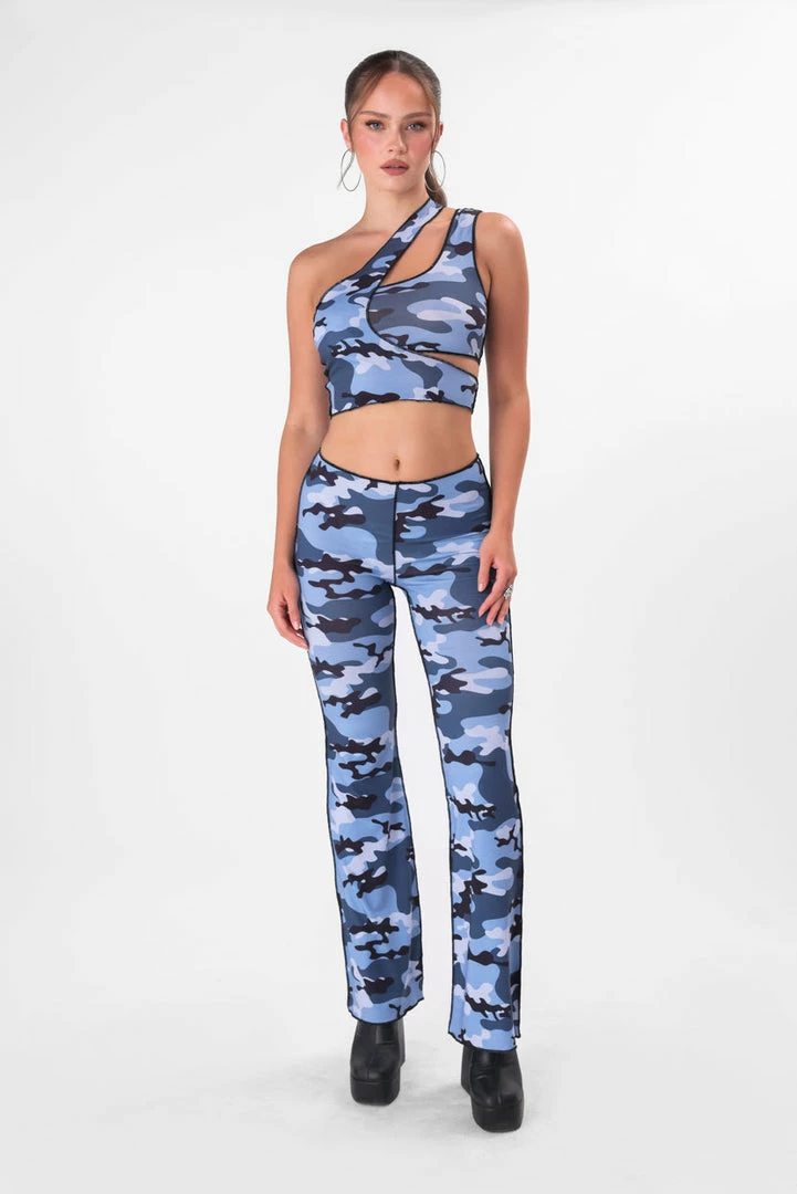- She a fashion killa. One-shoulder crop top in all-over camouflage print featuring layered and cut-out design.