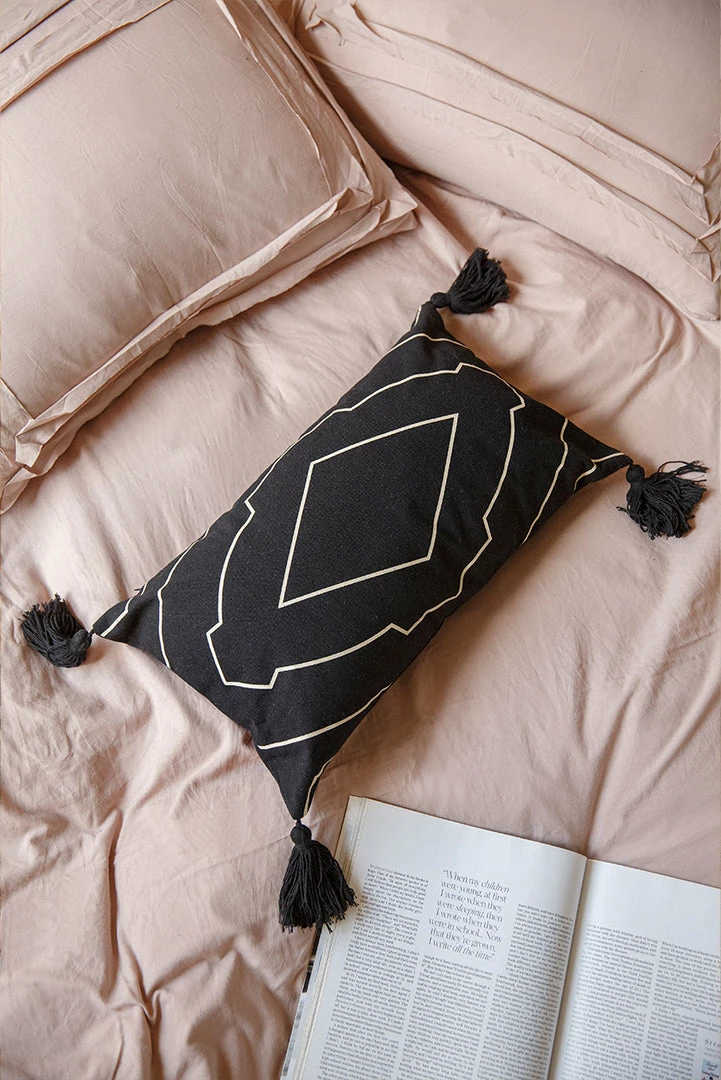 - It’s the minimal aesthetic for us. Rectangle throw pillow cover with geometric print and tassel embellishments.
