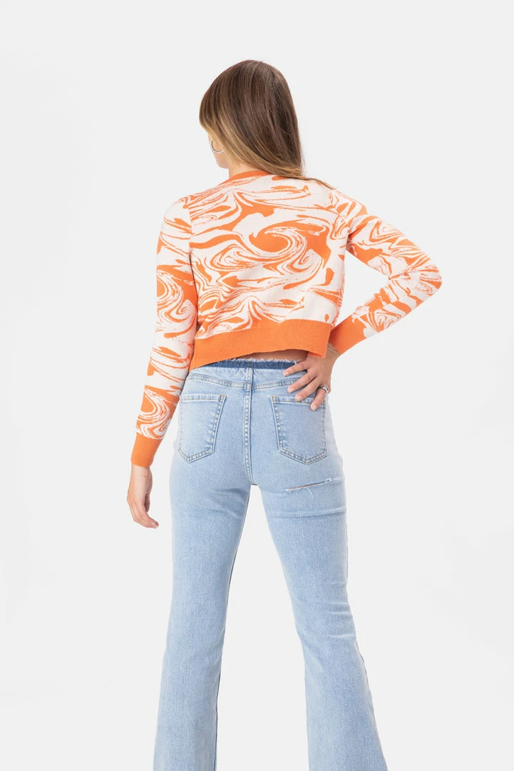 - Such a groover. Cropped, stretchy knit cardigan in all-over marble print with button closure and wide, ribbed outline.