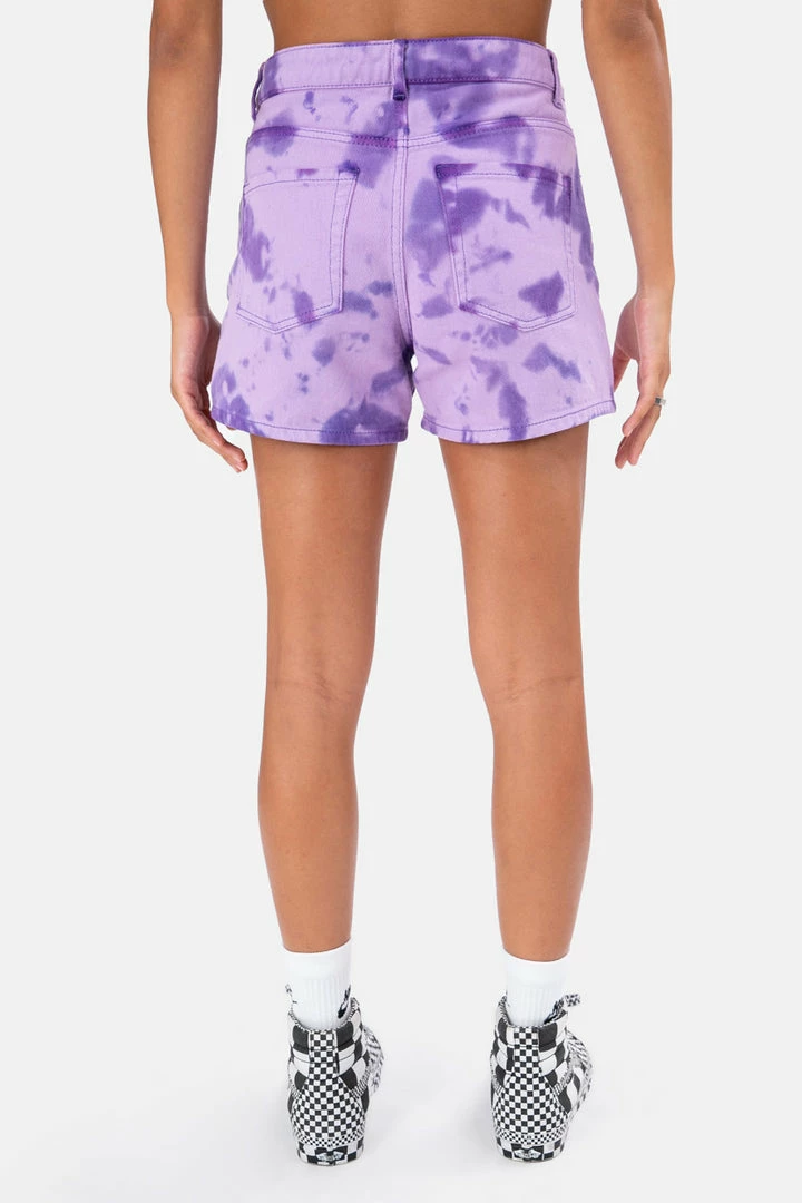 - Get into the groove, bb. High waisted denim shorts with buttons closure, belt hooks, 3 front pockets and 2 back pockets in an all-over tie-dye print!