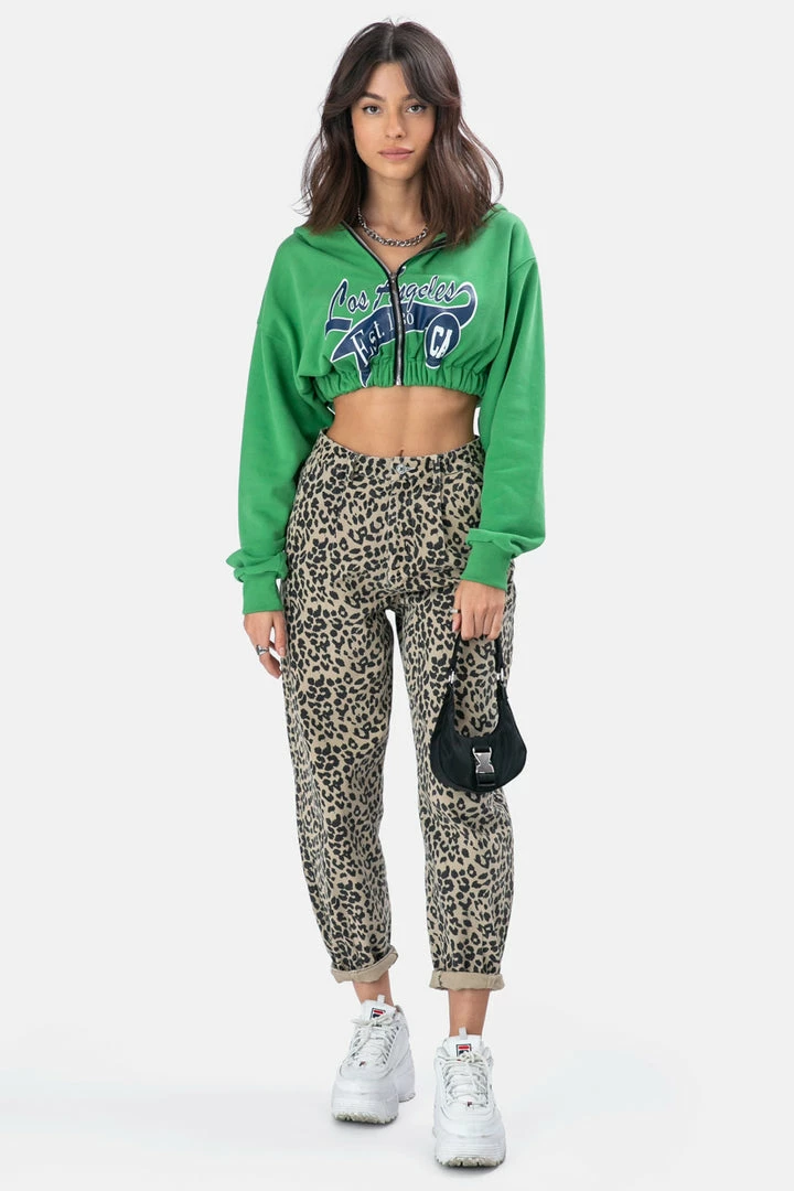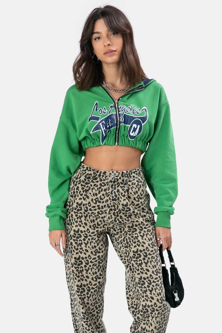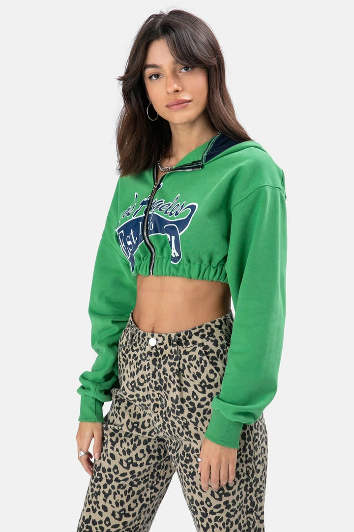- West Coast is the best coast! Super cropped graphic print hoodie featuring zip-front and banded waist details
