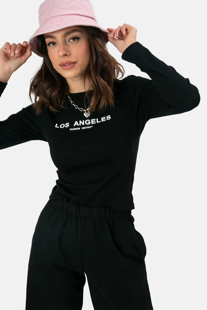 - Take me to the City of Angels, baby! Long sleeve t-shirt featuring Los Angeles graphic print typography in front