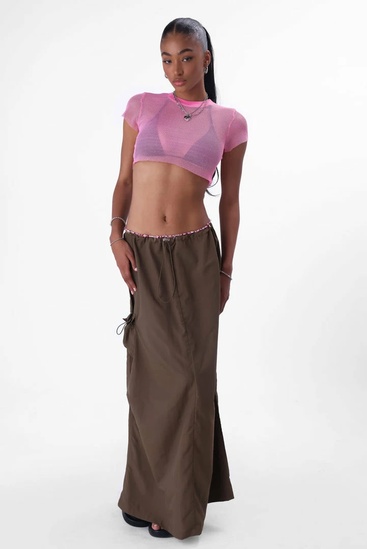 - Layer player. Fishnet cropped top in bodycon fit with short sleeves, ribbed crewneck and raw-cut hem.