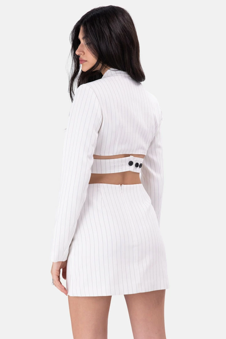 - Got some unfinished business to attend to. Blazer style cropped jacket in all-over pinstripe pattern featuring wrap-around waist ties with button closure. Including notch lapels, padded shoulders, faux breast welt pocket and a soft inner lining.