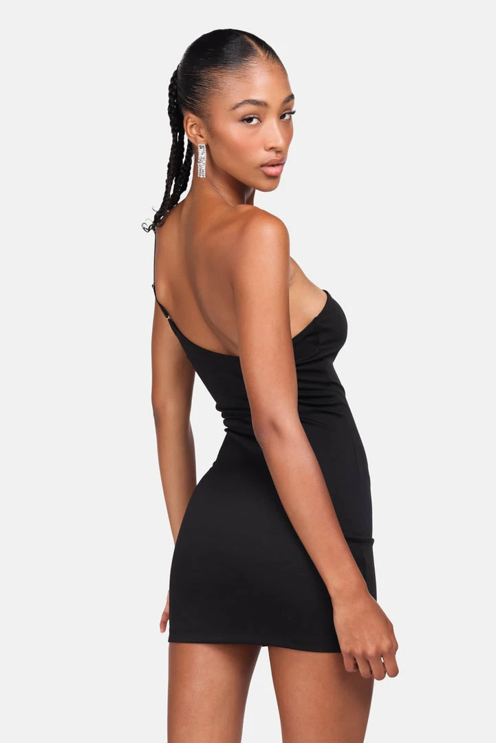 - Ready for an iconic moment? Stretchy mini dress in bodycon and one-shoulder fit with mega-glam rhinestone strap.