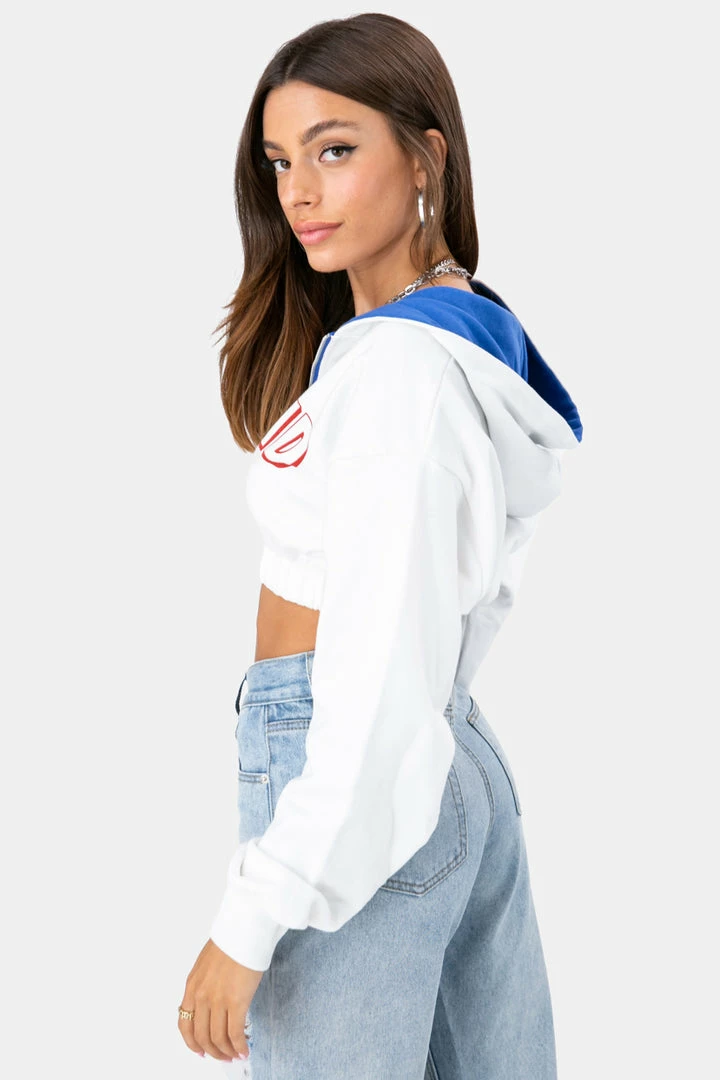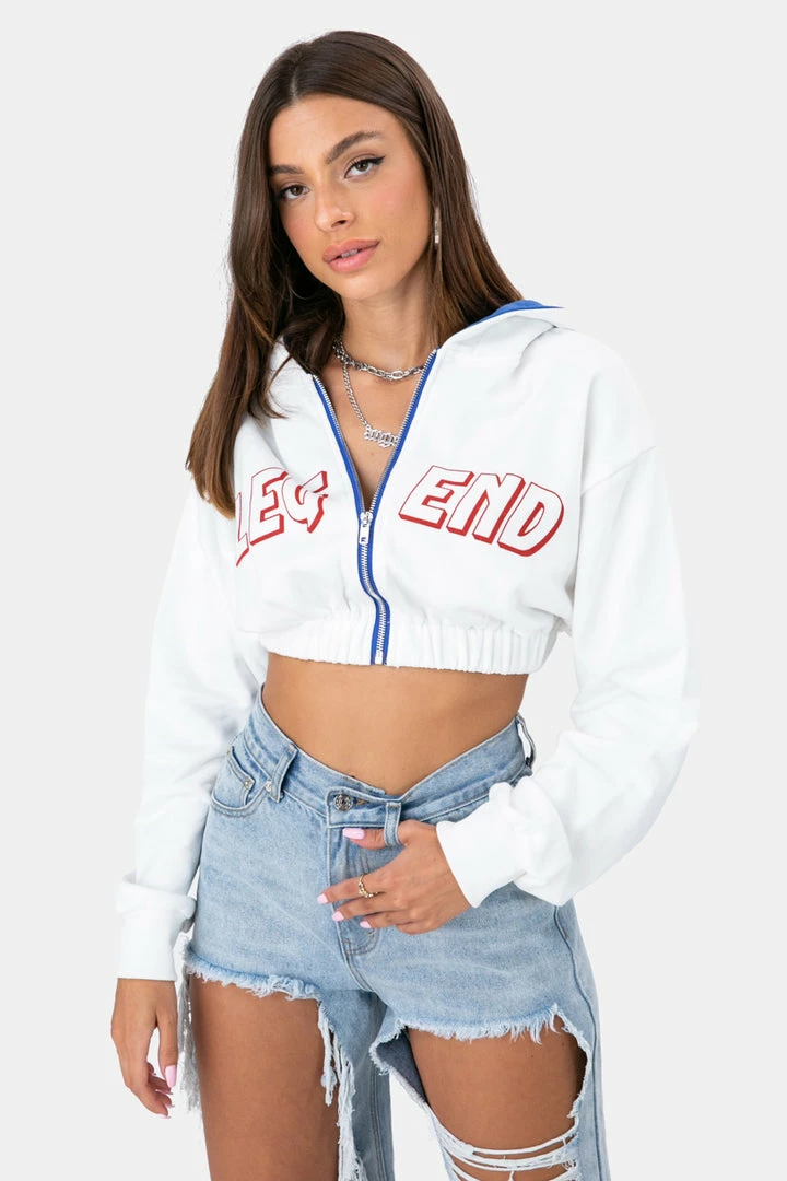 - Yes, you’re a living legend, so own it! Super cropped graphic print hoodie featuring zip-front, fitted cuffs and an elastic waistband.