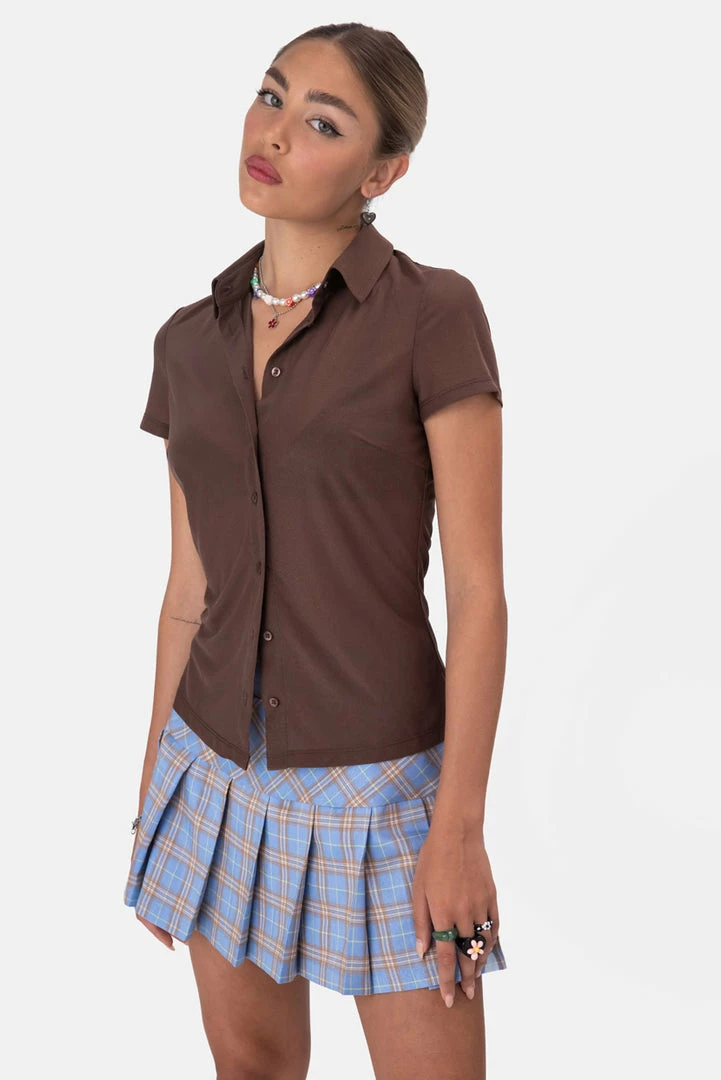 - Lighten up, boo. Semi-sheer button-down shirt with classic collar and short sleeves.