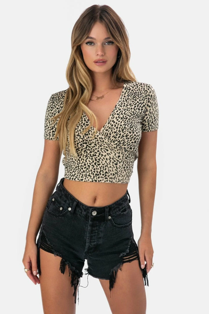 - Leopard print wrap top in a slightly cropped fit featuring deep-V and crossover front with interchangeable tie strings in back or front, whatever you’re feeling