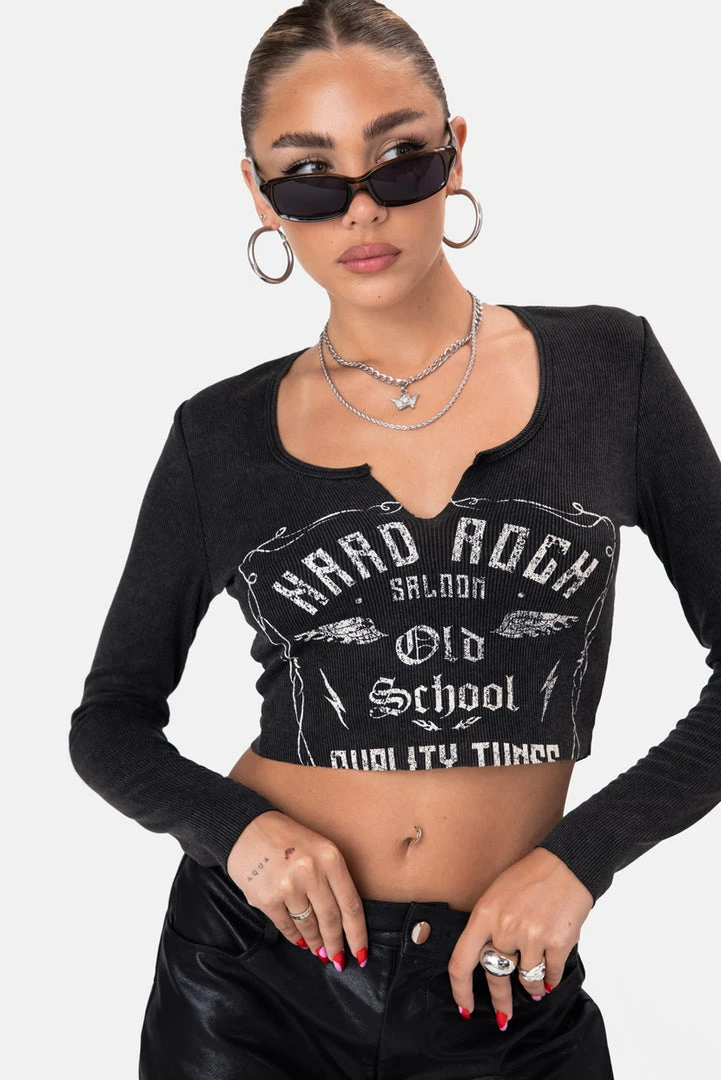 - Old school is the best school. Ribbed T-shirt in cropped fit with vintage-style graphic print on the front, scoop neck with V-cut, long sleeves and raw-cut hem.