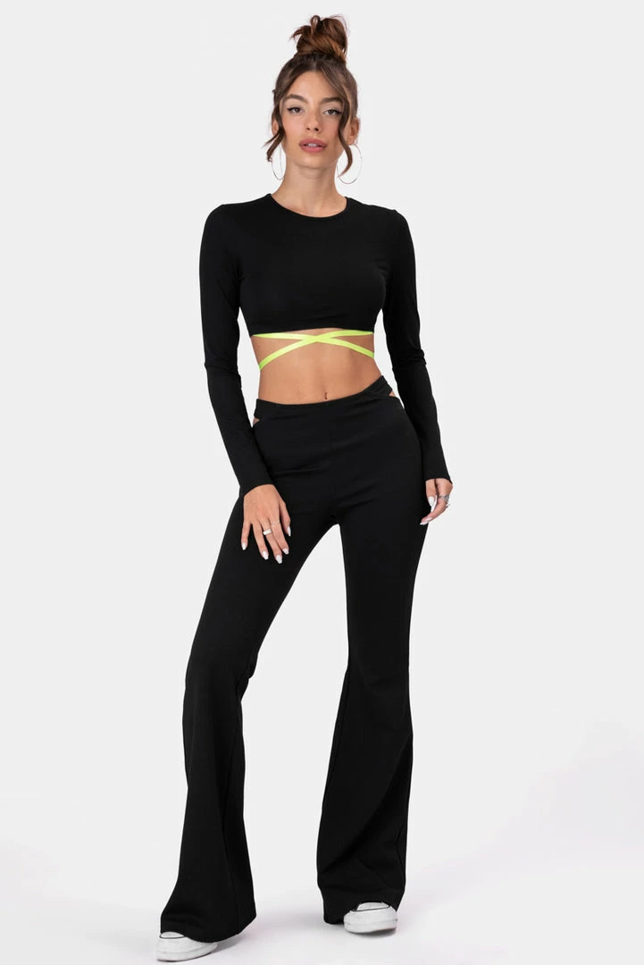 - Totally gushing over this cut! Soft and stretchy pants with an elastic waistband, a sassy high leg cut-out waist detail, both in the front and the back, and a flared wide leg. Dang.