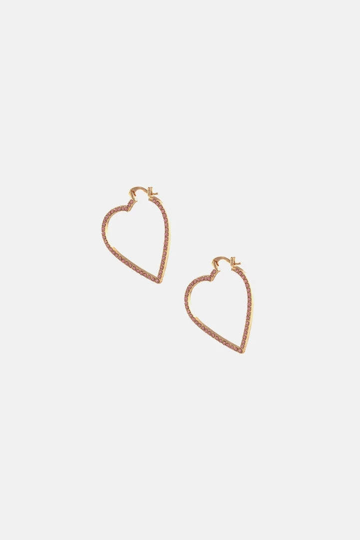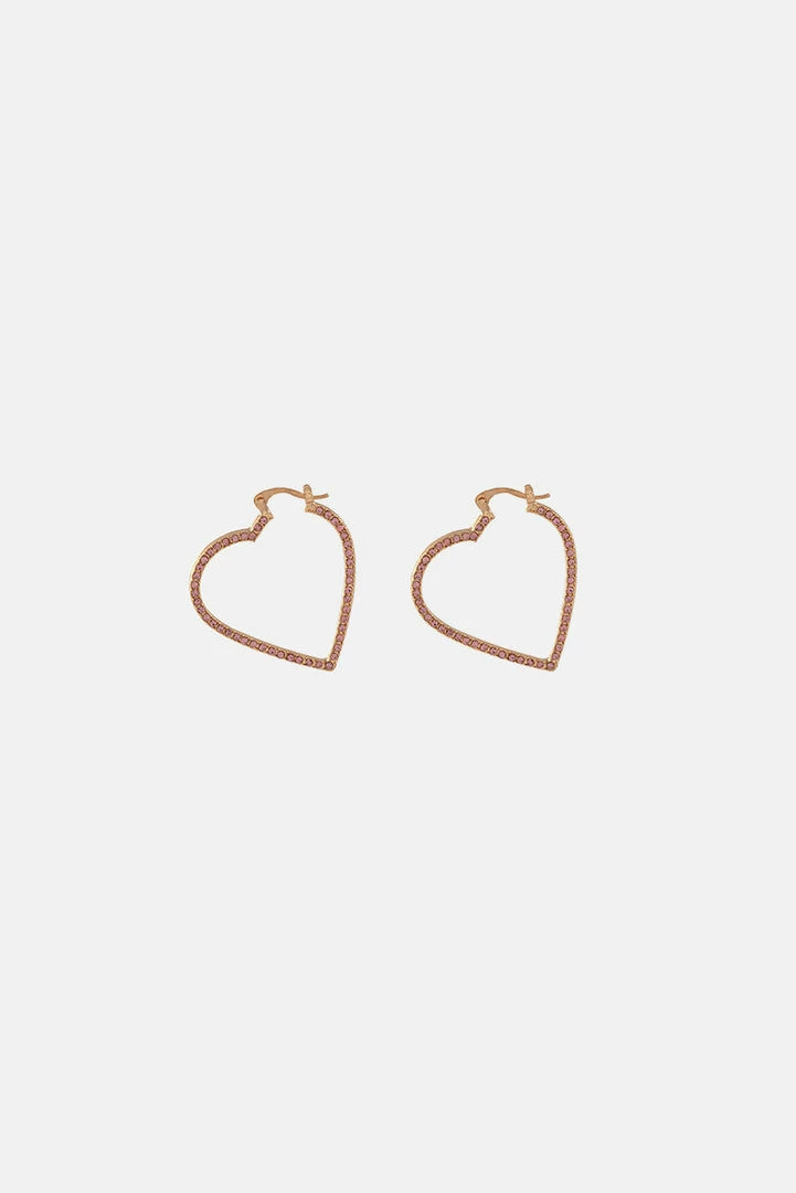 - Major style crush. Metallic heart shaped hoop earrings with rhinestones all-over and post back closure.