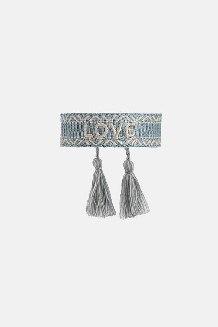 - Hands up, baby, hands up. Wide friendship style bracelet featuring embroidery and adjustable closure with tassels.