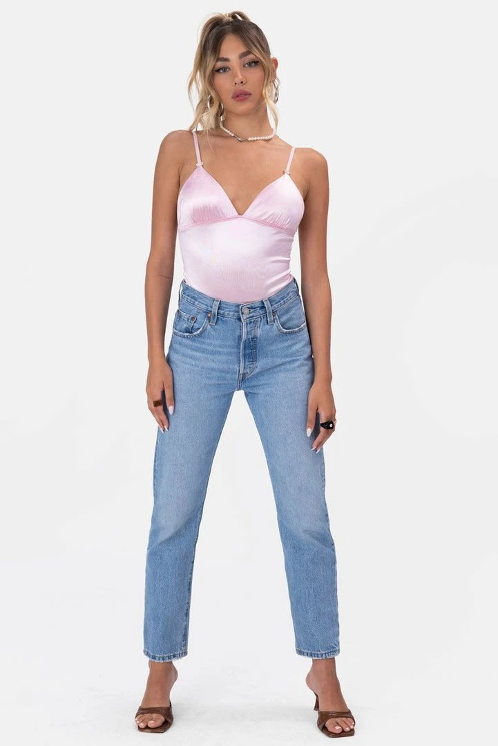 - Glam it up. Satin finish bodysuit with deep V-neck, adjustable spaghetti straps with rhinestone, heart-shaped sliding detail, cup design, high leg cut and hidden snap button closure.