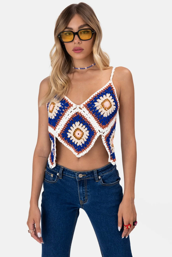 - The summer of love, 2021. Crochet top in floral pattern all-over with sweetheart neck and back, spaghetti straps and an asymmetric cropped hem.