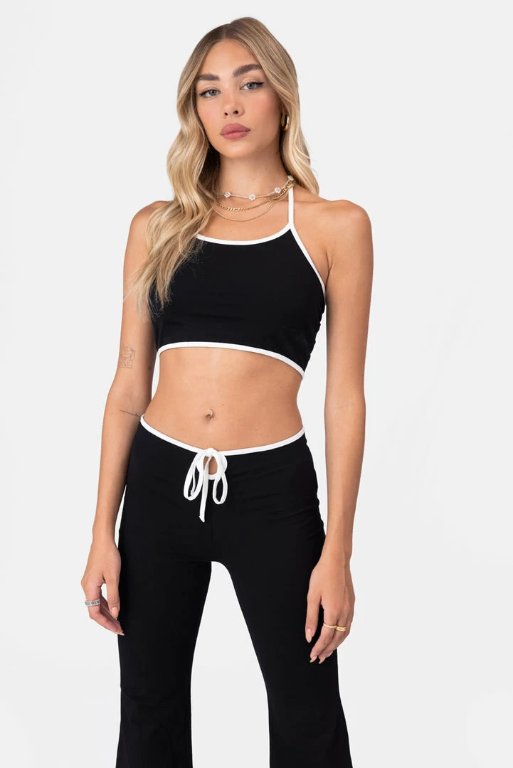 - Along the lines. Stretchy crop top featuring a halter neckline with tie strings and a contrasting outline.