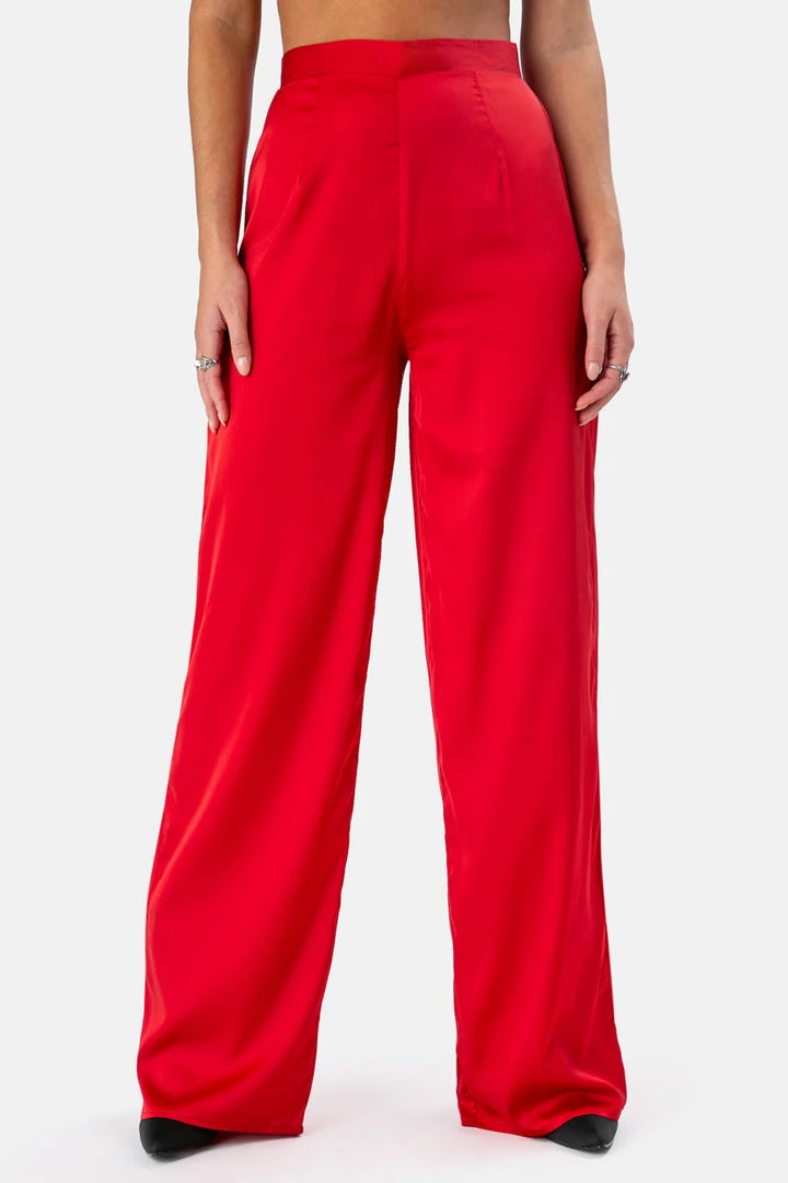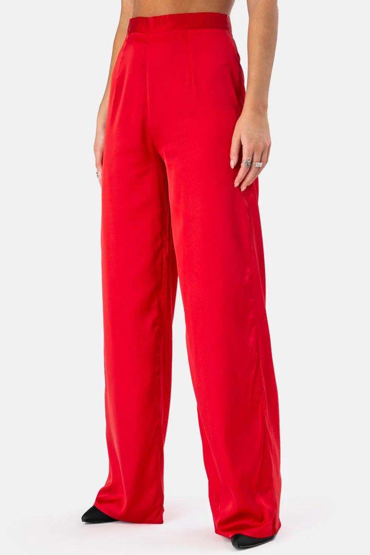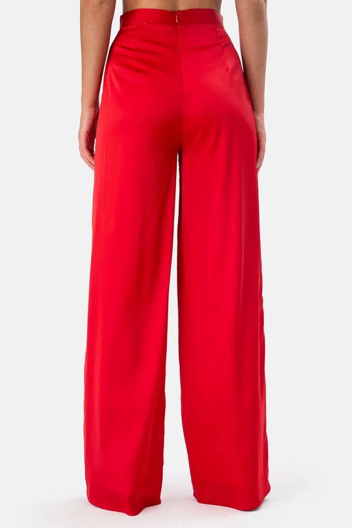 - Wide leg pants in satin finish featuring high waisted fit and hidden zip-closure in back