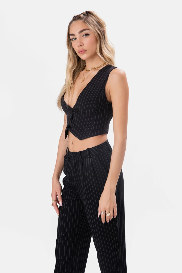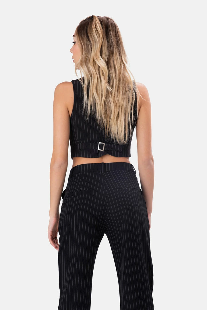 - Elegance-meets-punk. Tailored vest in cropped fit and all-over pinstripe print with deep V-neck, button closure, low arm cut and back belt detail with metal buckle.