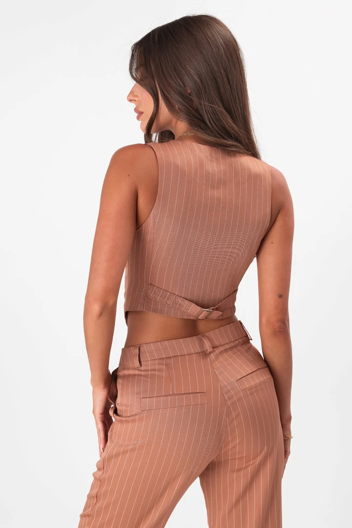 - Elegance-meets-punk. Tailored vest in cropped fit and all-over pinstripe print with deep V-neck, button closure, low arm cut and back belt detail with metal buckle.