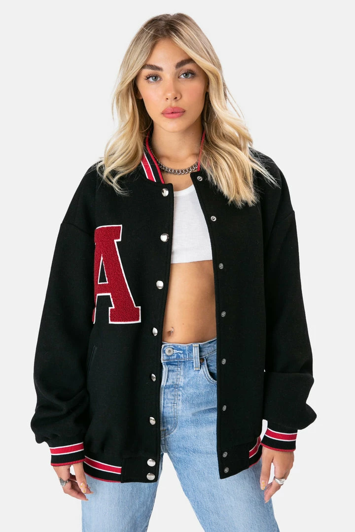 - Youโre on the A-Team now, babe. Super-comfy letterman jacket with classic letter patch in the front, striped rib trimmed outline, snap button closure and side pockets. Own it, bb.
