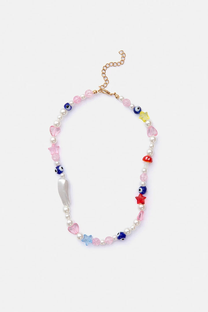 - Play nice. Necklace in mixed design beads with adjustable lobster clasp closure.