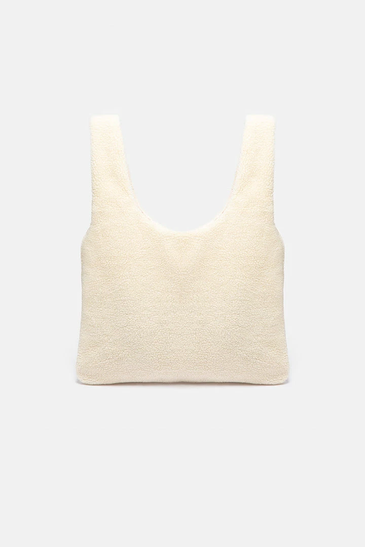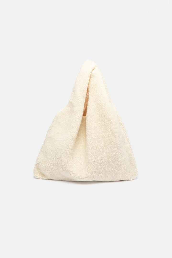 - We’re taking chic to the next level. Fuzzy textured carry bag with two handles creating a unique knot by looping into each other.