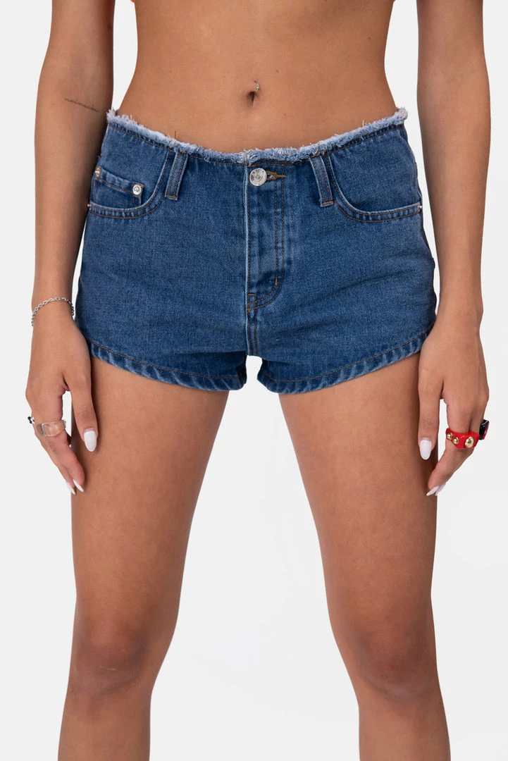 - Lowkey, planning to obsess over these. Medium washed denim shorts in a low-rise fit with a fringed waistline, fly button closure, belt loops and a 5-pocket design.