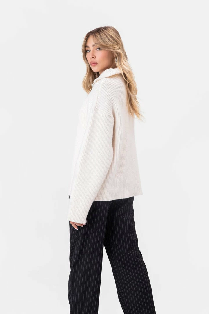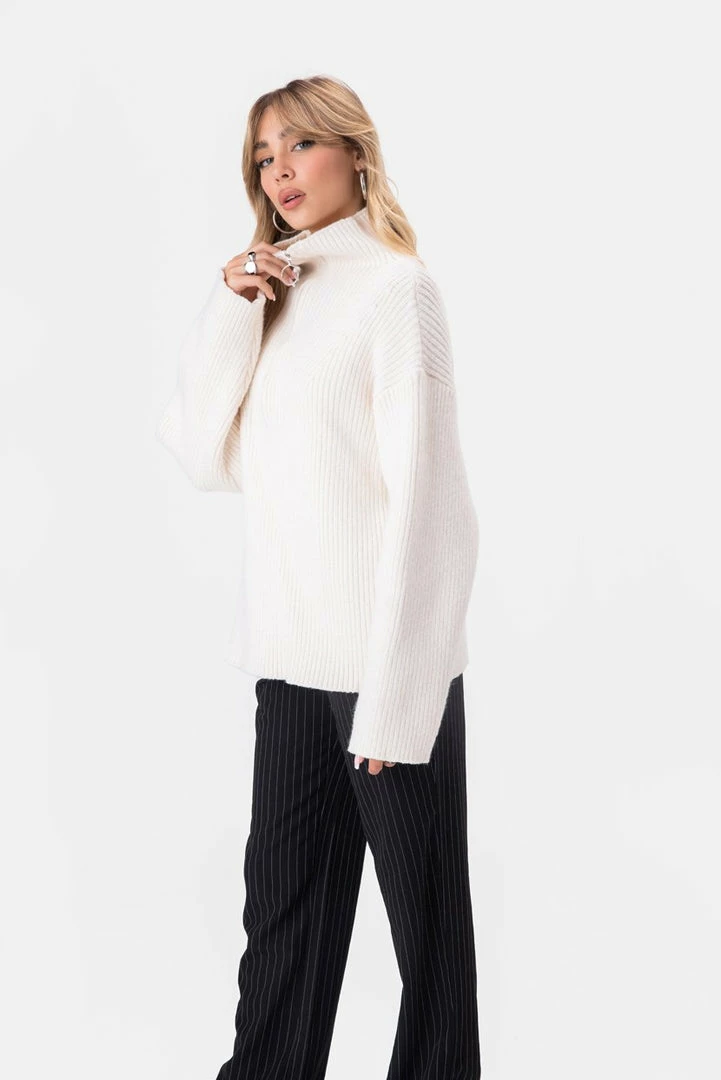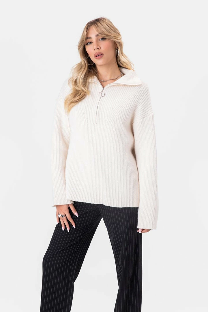 - Tell ’em to zip it. Rib knit sweater in an oversize fit with front zip detail, turtleneck and dropped shoulder line.