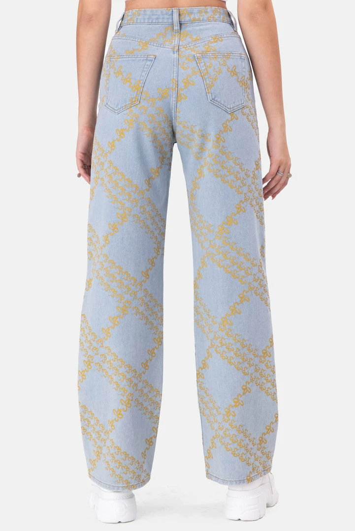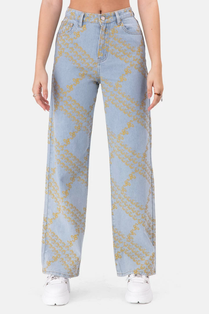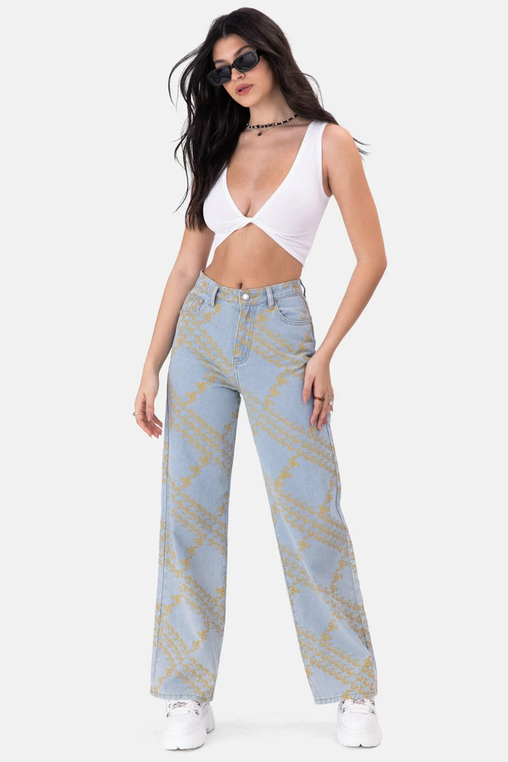 - Keep blooming, hun. Wide-leg jeans in high-waisted fit with washed flower pattern all-over and belt loops. Including a button and zip closure, front round pockets and back patch pockets.