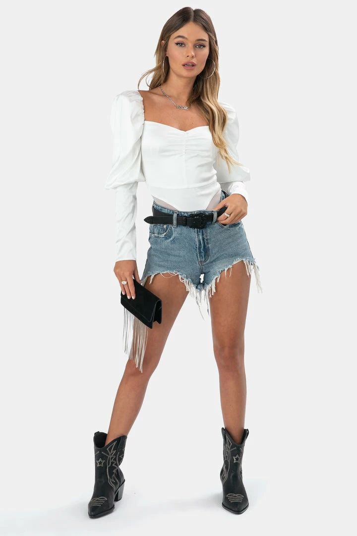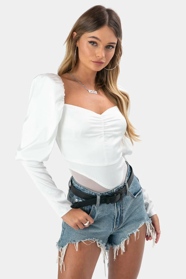 - Totally legit to start planning a White Party just so you can wear it. Shiny satin finish bodysuit with mesh bottom featuring ruched sweetheart neckline, long puff sleeves and hidden back-zip closure
