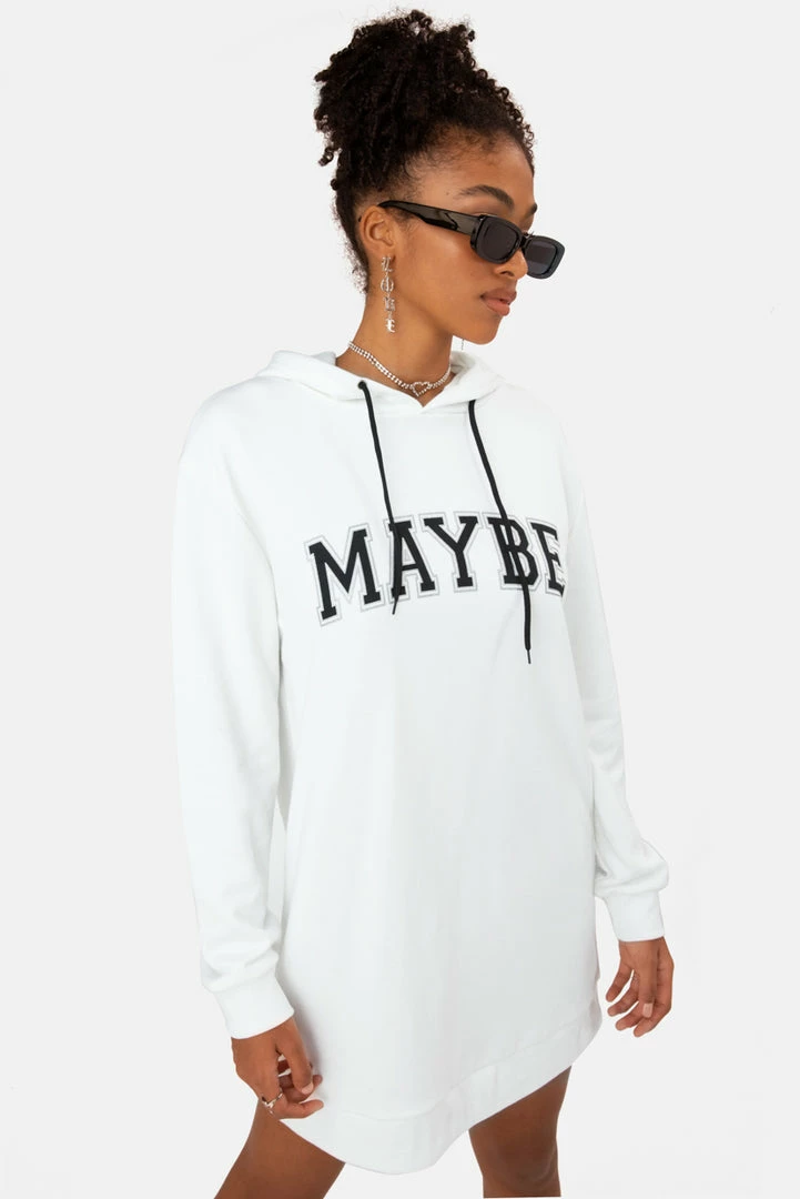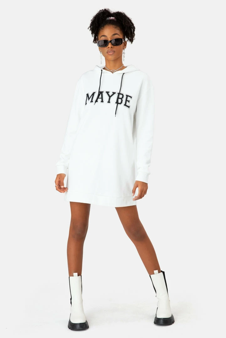 - Maybe, bby, you’ve just landed the perfect fit for a stylish, chic and cozy look. Super-relaxed sweatshirt dress featuring graphic print on the front, hood with drawstring, plus banded cuffs and hem. Actually, we’re certain you have!