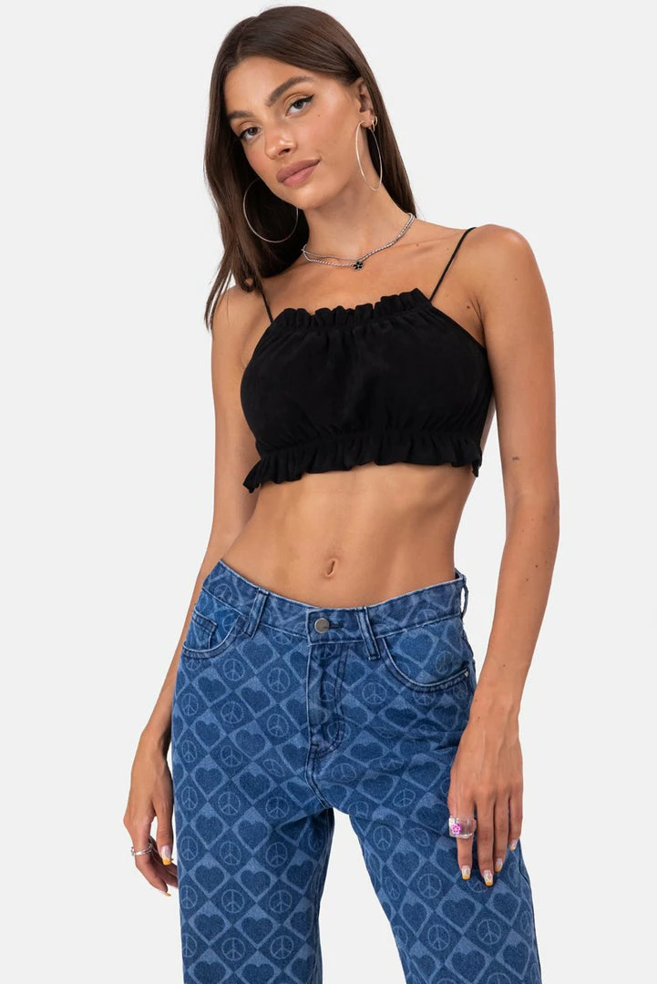 - Let’s wrap this up! Super cropped top made of faux suede material, featuring ultra thin straps and ruche detail in the front.