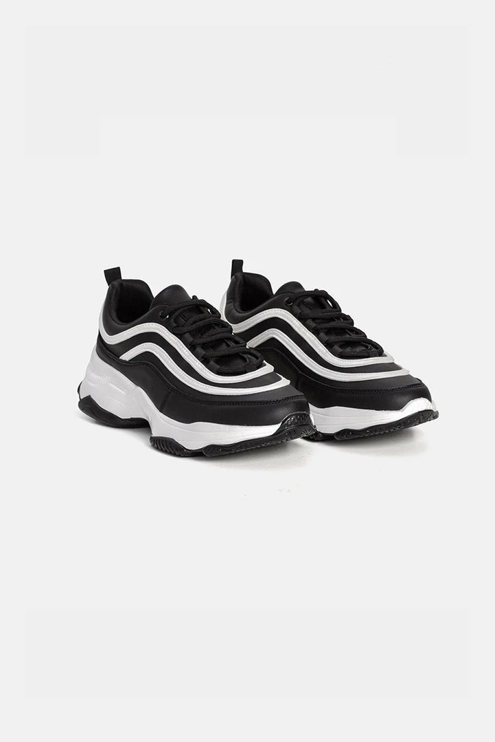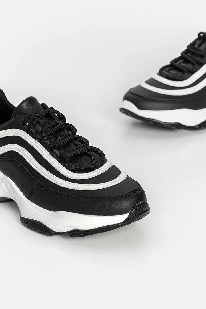 - B&W delight. Color-block style sneakers featuring contract stripe detail, lace-up closure, chunky sole and a back pull loop.