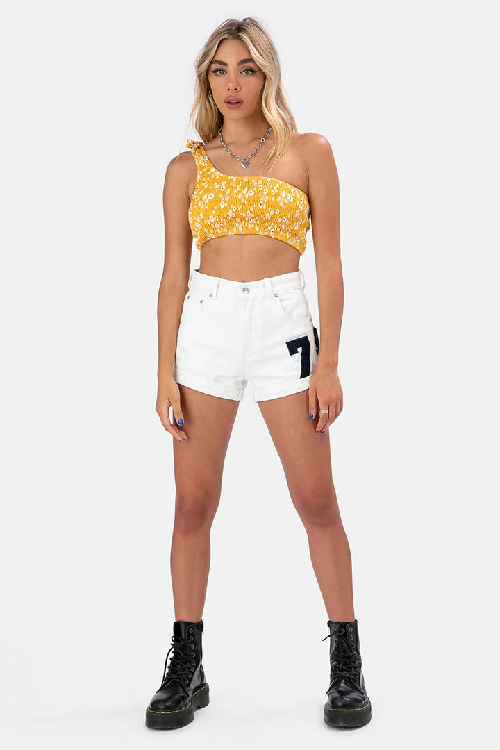 - Wake up and smell the summer vibes! Super cropped top in shirred material, with all-over floral print. One-shoulder strap that ties together.
