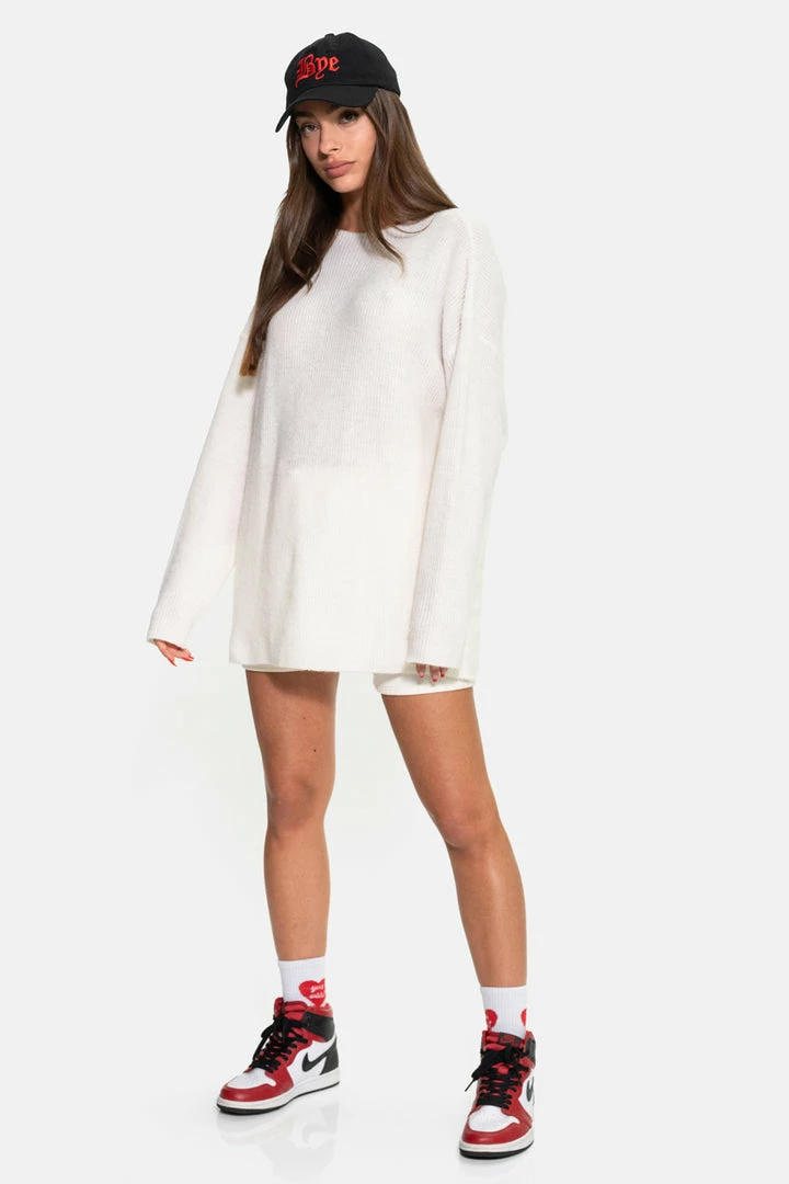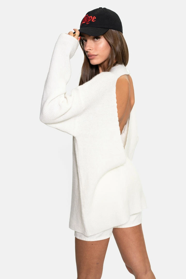 - Baby got (no) back. Lightweight and soft knit sweater in a slouchy fit with mega-chic cut-out detail in the back, crew neckline and dropped shoulder line.