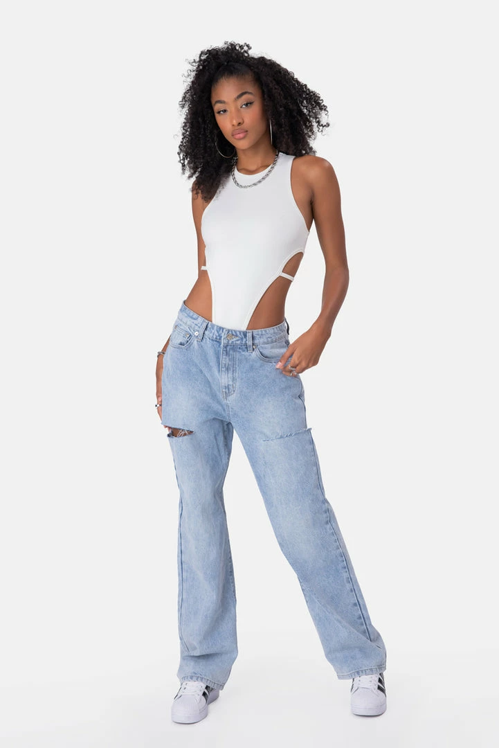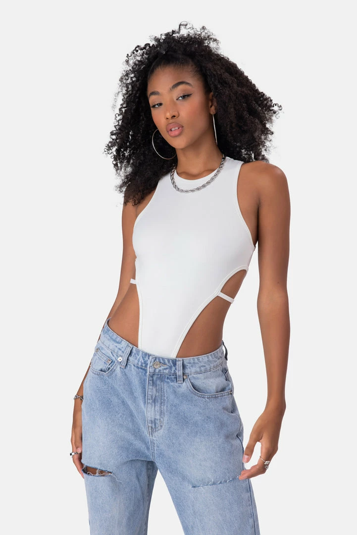 - Cut to the chase. Stretchy bodysuit with a super high-leg cut, round neckline, racerback, low arm cut and hidden snap button closure.