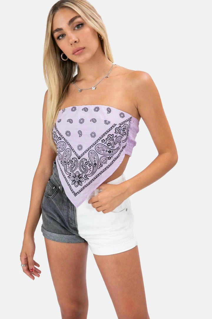 - Trend game on point! Bandana printed top that ties closed in the back.
