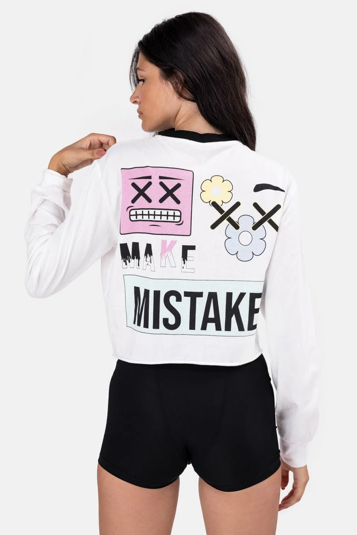 - Make mistakes, cuz yolo. Super-cute long-sleeved cropped t-shirt with mega-fun graphic on the front and back and a raw-cut cropped hem. .