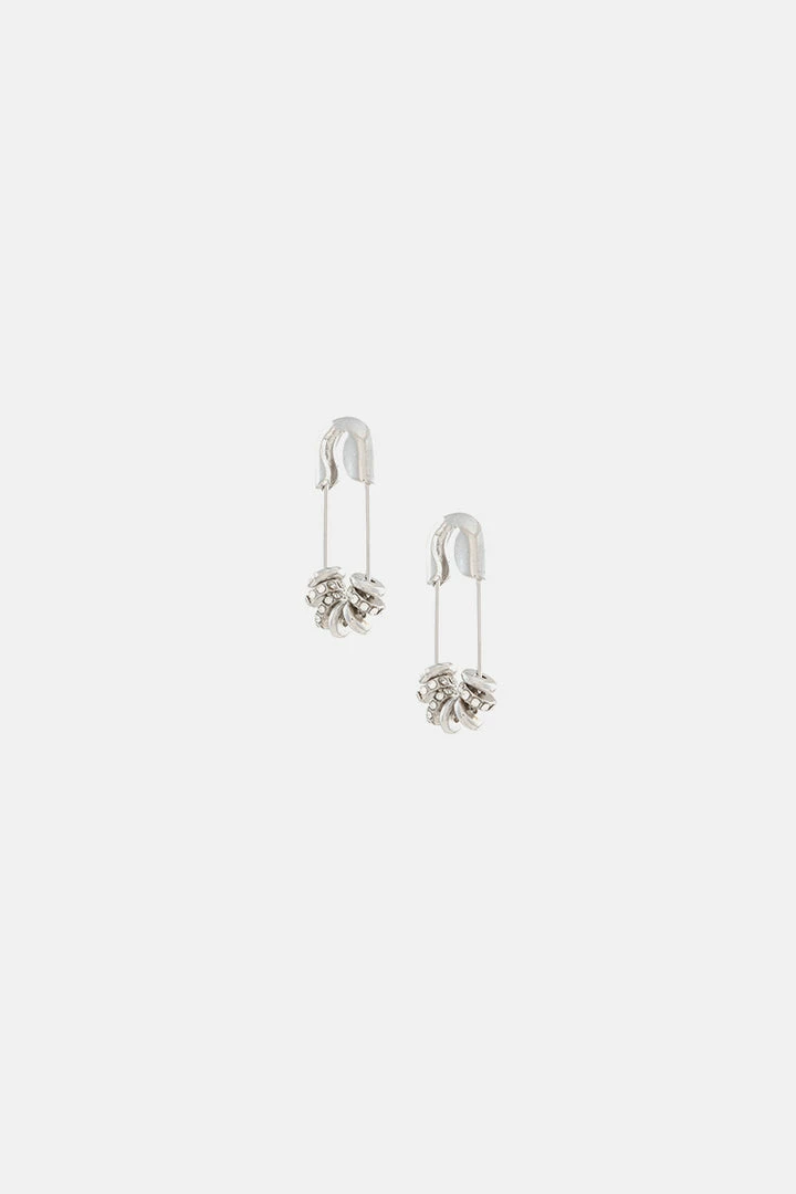 - Edgy, baby. Metallic earring in safety pin design with tinny o rings and rhinestone detailing.