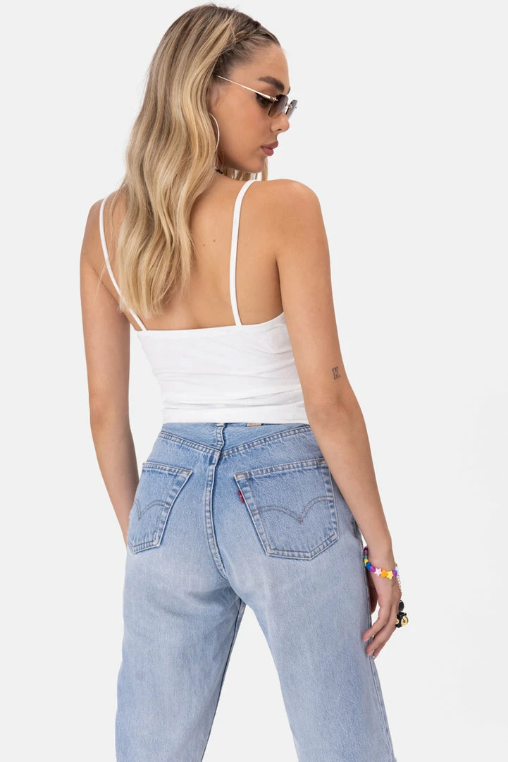 - Can’t go wrong. Cropped top featuring spaghetti straps, ruched chest with tie strings and a scoop neck.