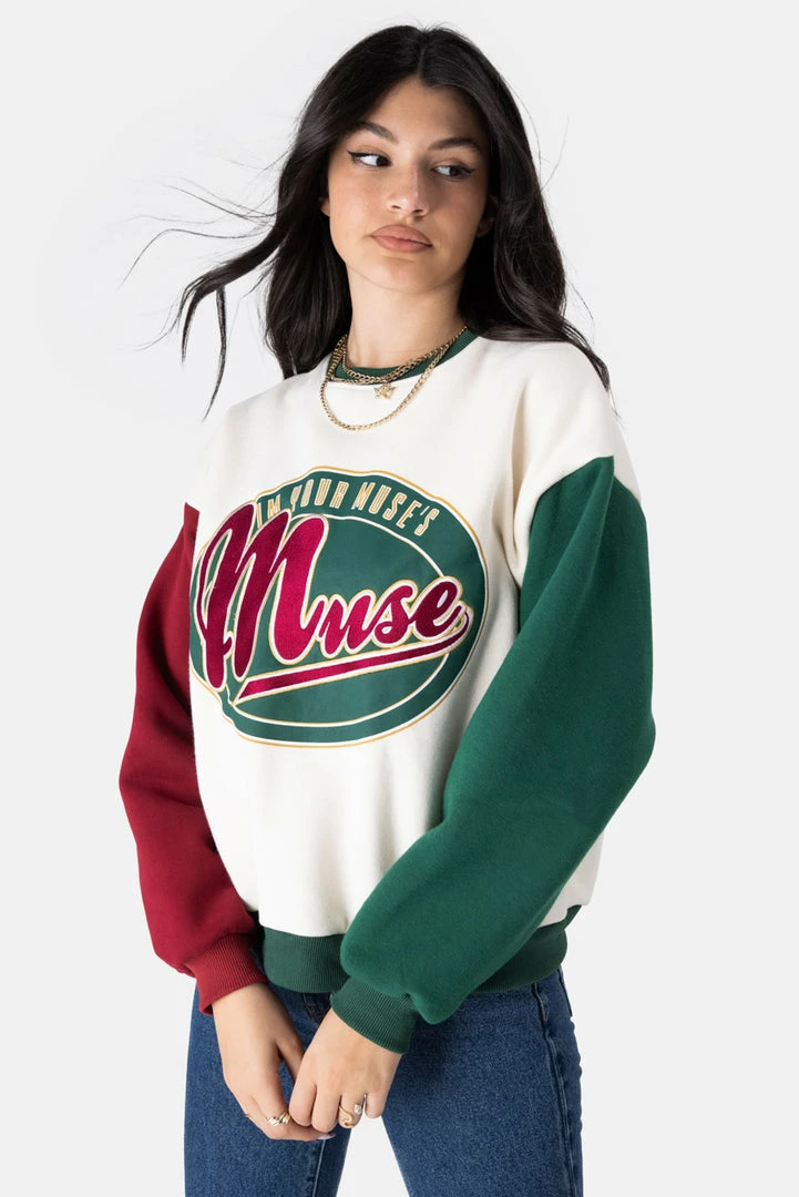 - You’re muse’s muse. Warm sweatshirt in color-block design with print and embroidery in the front, dropped shoulder line, round collar, and a ribbed outline.