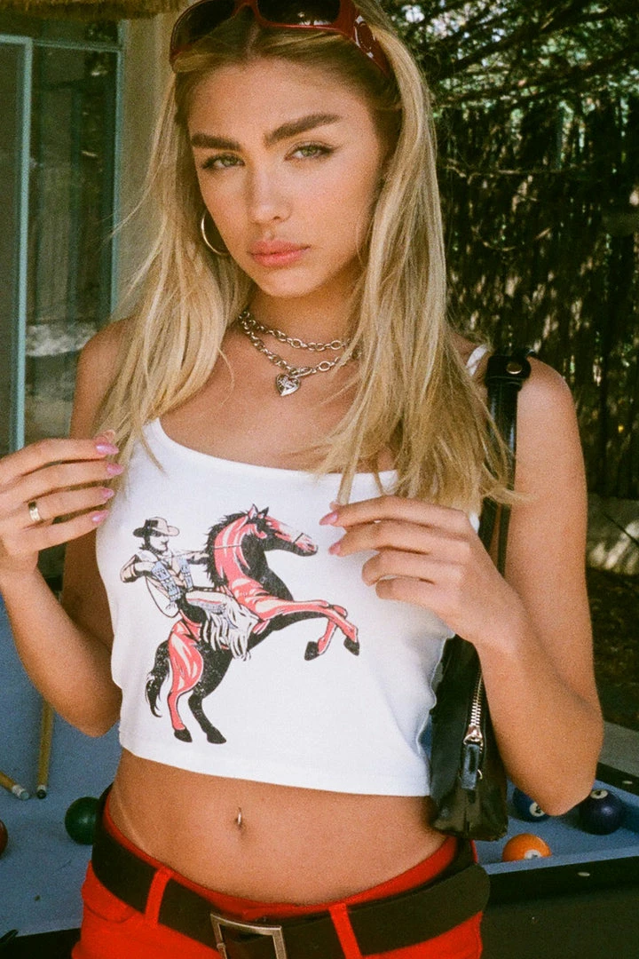 - Yippee ki-yay, grl! Cropped top with mega-fun print on the front, scoop neckline and adjustable spaghetti straps.