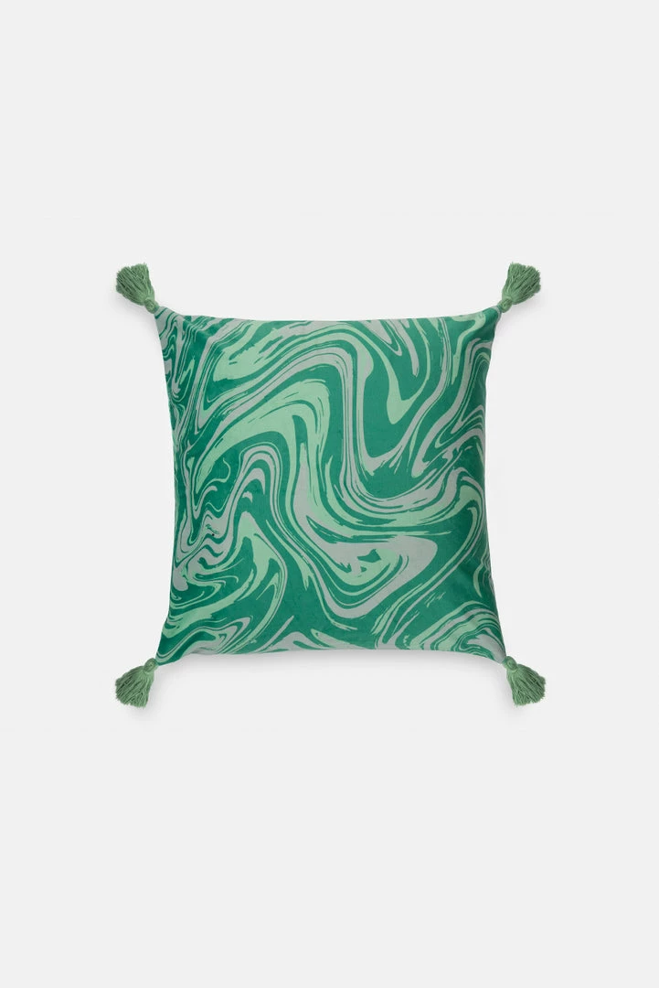 - Whatta groover. Square throw pillow cover in all-over abstract print velvet with tassel embellishments.