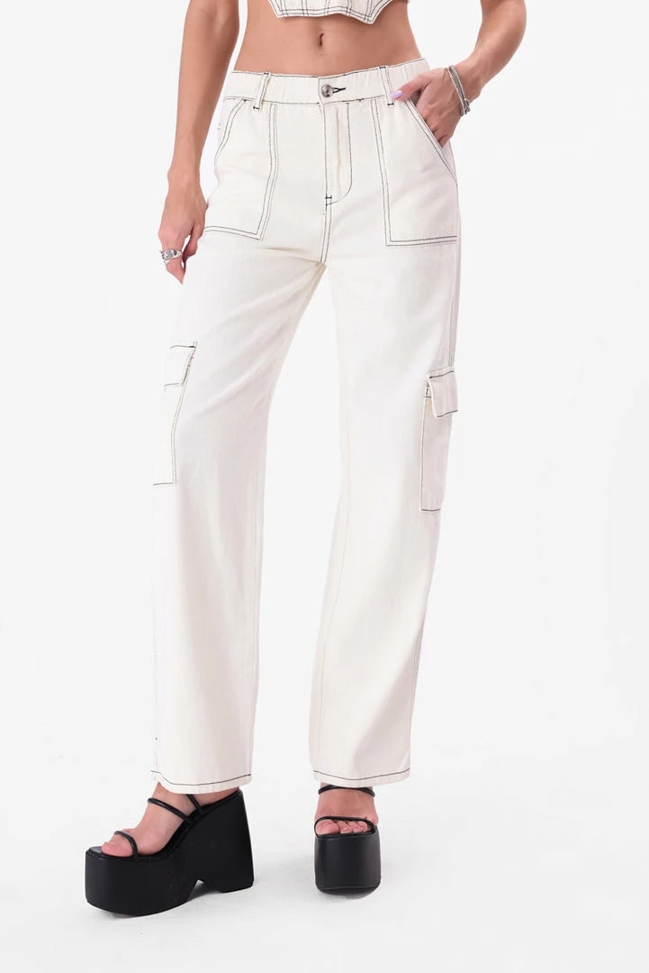 - In stitches. Straight fit jeans featuring side cargo pockets and elastic waistband with button and zip closure. Contrast seams all-over, large front pockets and back patch pockets.