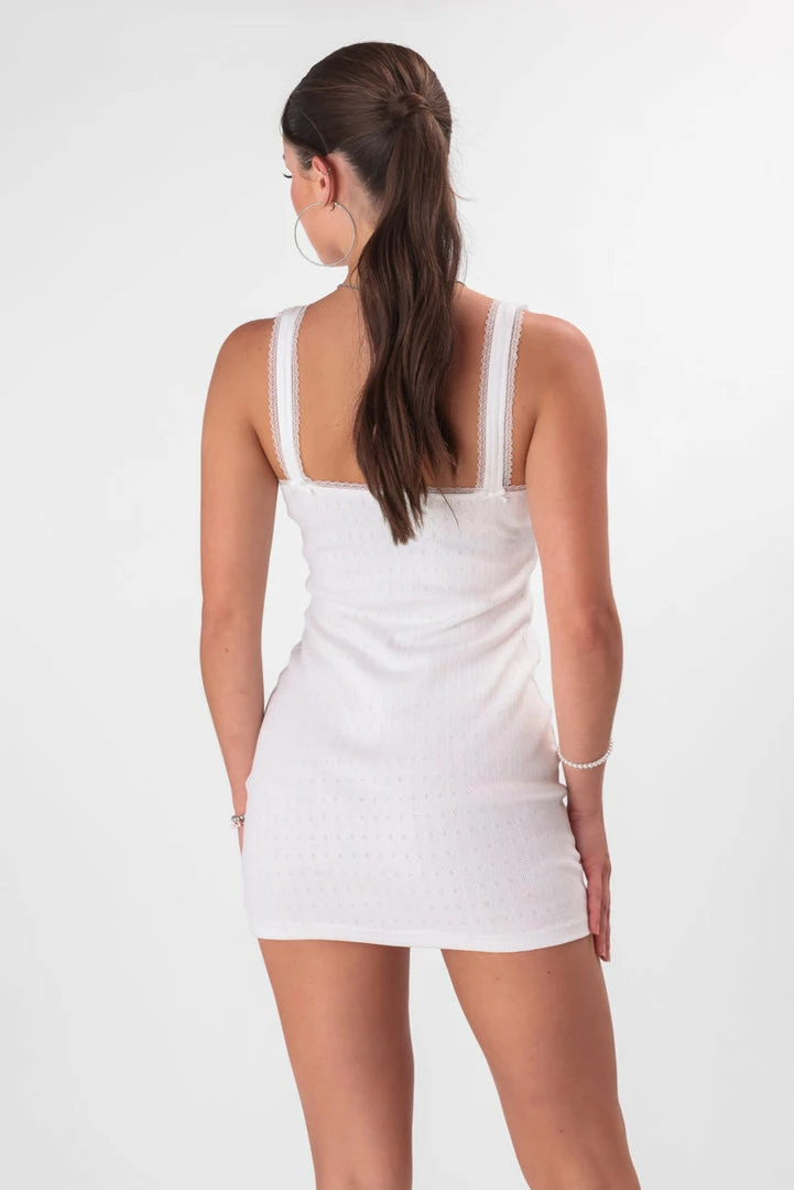 - Play it cute. Sleeveless mini dress in lightweight, stylish, summery fabric featuring a scoop neckline with lace trim.