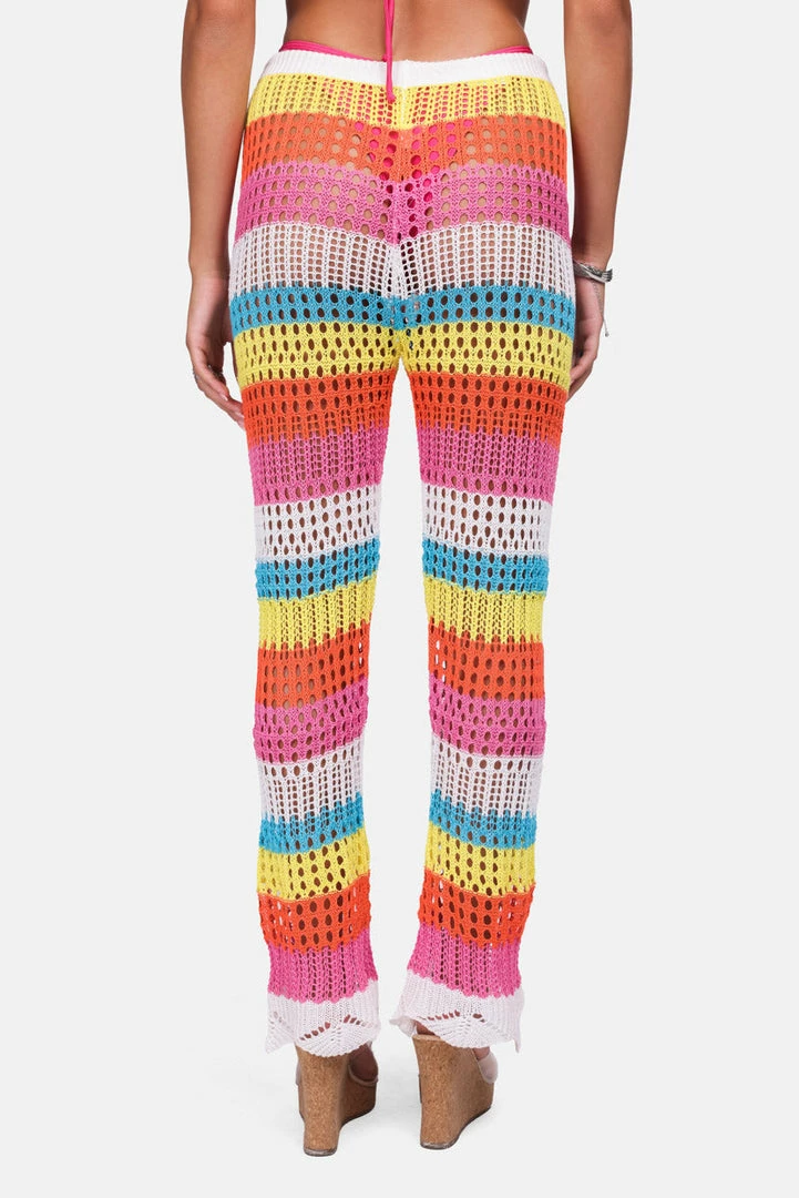 - Next level groover. Crochet knit pants in colorful stripes all-over and flared fit featuring an elastic waistband with drawstring.