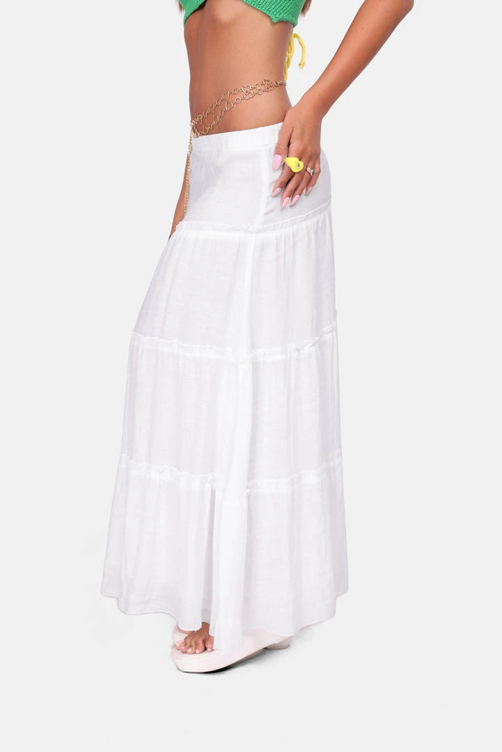 - Serving boho vacay. Tiered maxi skirt in natural waist rise with inner lining and elastic waistband.